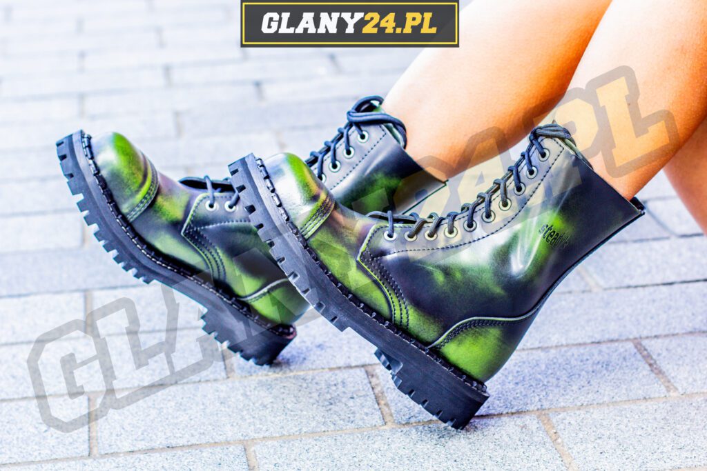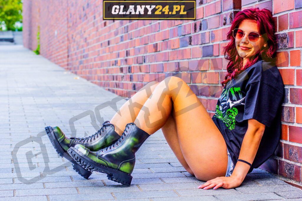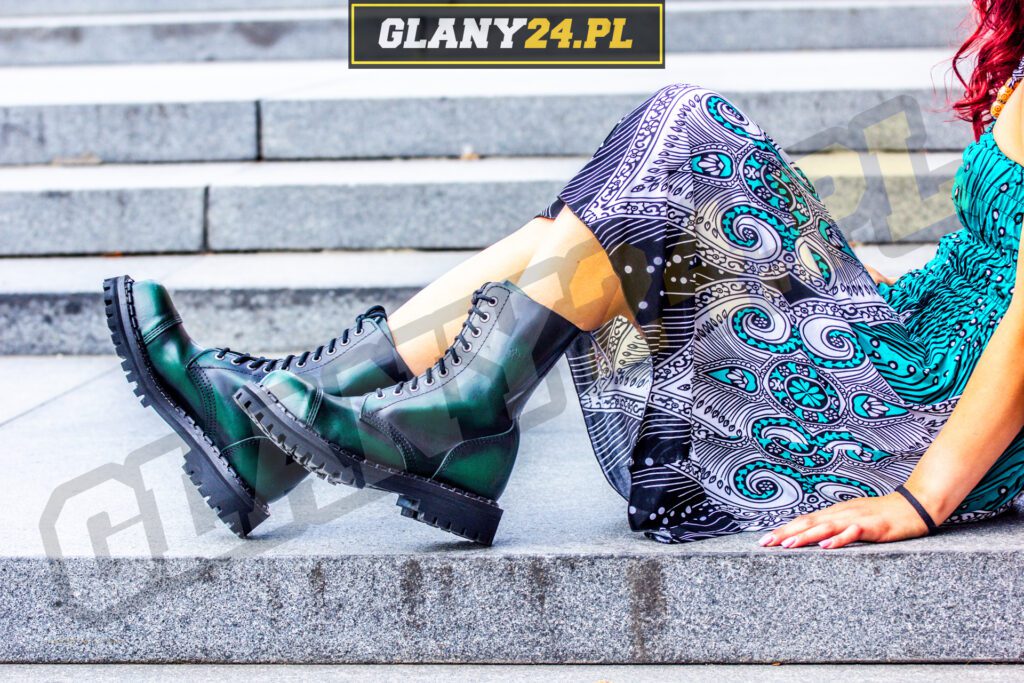 Glany przecierane na zielono to niezwykle interesująca odmiana kolorystyczna glanów, dzięki czemu możemy mieć pewność że nasze glany na pewno wyróżnią się spośród innych i podkreślą nasz wygląd. Glany przecierane na zielono pasują idealnie do ciemnych jak i różnokolorowych stylizacji.