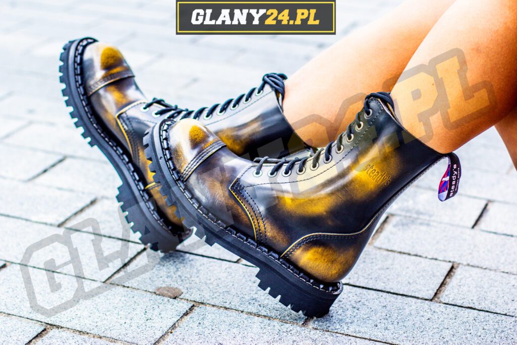 Glany przecierane na żółto to niezwykle interesująca odmiana kolorystyczna glanów, dzięki czemu możemy mieć pewność że nasze glany na pewno wyróżnią się spośród innych i podkreślą nasz wygląd. Glany przecierane na żółto pasują idealnie do ciemnych jak i różnokolorowych stylizacji.